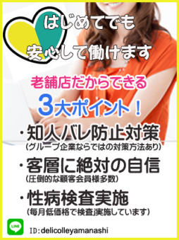 - こんにちは山梨人妻デリバリーコレクションです。当店は人妻、熟女にこだわり、年齢も高い女性を募集しております。40歳以上の女性で転職を考えていたり、プラスαの収入を望んでいる方は多いと思います。家庭のことや子供のこと、自分自身のことでお金はあ...